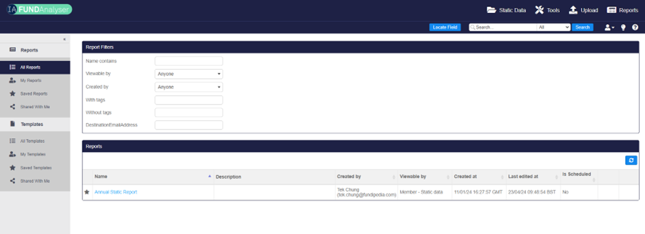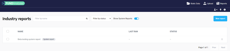 2. You should see the following screen, with pre-set system report. If you cannot see it, ensure the “Show System Reports” toggle is enabled. The idea is that IA admins can create commonly used report templates.