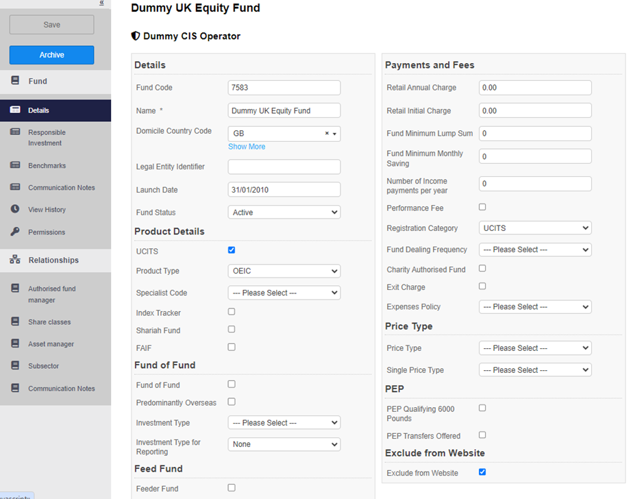 1. The left side menu shows different pages of fields, as well as relationships to the fund.