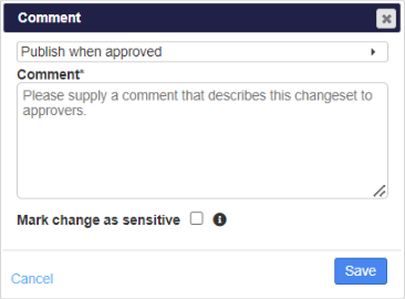A confirmation box will appear where a comment that describes the change made - this allows the IA admins to understand the amendment before approving/rejecting it. In addition, the date of publication may be controlled (please see next section).