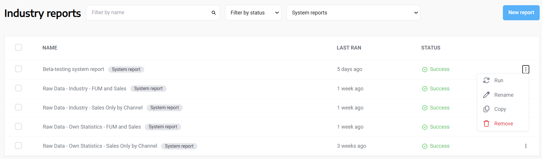 We have the feature that allows users to duplicate Industry Report instances to save time when replicating similar configurations; you can also make copies of system reports (pre-set reports) in order to make your own amendments to the configurations.